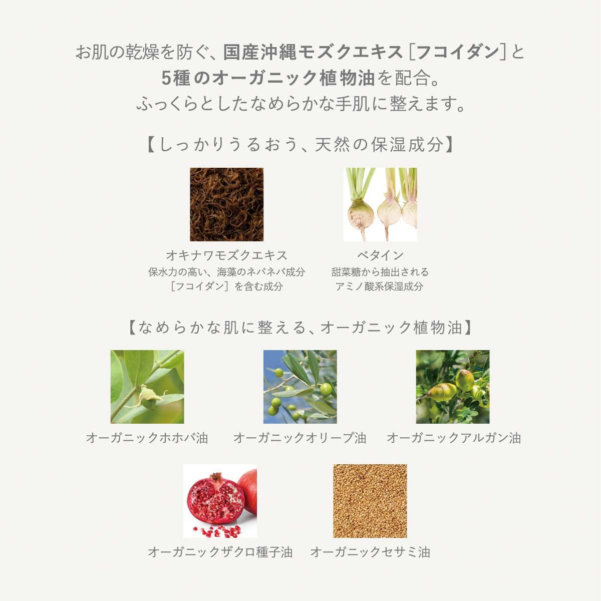 水、プロパンジオール、ホホバ種子油*、オリーブ果実油*、スクワラン、ヒマワリ種子油、水添ナタネ油アルコール、ステアリン酸、ペンチレングリコール、ベヘニルアルコール、パルミチン酸セチル、ベタイン、カプロイルプロリンNa、アルガニアスピノサ核油*ザクロ種子油*ゴマ油*グリチルリチン酸2K、オキナワモズクエキス、ミツロウ、ステアリン酸スクロース、ジステアリン酸スクロース、ミリスチン酸ポリグリセリル-10、キサンタンガム、トコフェロール、クスノキ木油、ユズ果皮油、ラベンダー花油、マンダリンオレンジ果皮油、ローマカミツレ花/葉/茎油、エンピツビャクシン油、アオモジ果実油